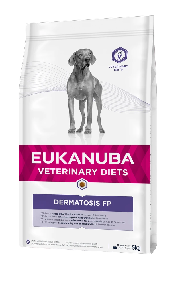 Les aliments EUKANUBA Veterinary Diets Dermatoses Poisson et pommes de terre pour chiens contiennent des sources sélectionnées de protéines (poisson) et de glucides (pomme de terre) et présentent une teneur adaptée en acides gras essentiels. Leur teneur ciblée en acides gras oméga favorise la santé de la peau et du pelage. La formule Dermatoses Poisson et pommes de terre comprend un mélange de fibres, dont de la pulpe de betterave à l’efficacité cliniquement prouvée, et des prébiotiques FOS qui contribuent à la santé du système gastro-intestinal. En présence d’intolérances alimentaires, la formule Dermatoses Poisson et pommes de terre doit être proposée en régime de 3 à 8 semaines. Si les signes d’intolérance disparaissent, l’aliment peut se substituer à la nourriture classique. En présence d’un problème de peau, la formule Dermatoses Poisson et pommes de terre doit être proposée en régime de 2 mois maximum. Avant de prolonger ce régime, demandez l’avis de votre vétérinaire. Cette formule apporte, en outre, des nutriments nécessaires à la santé et au bien-être des animaux.
