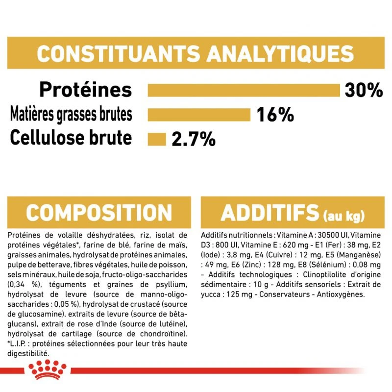 L’aliment contient une combinaison d’ingrédients pour favoriser la santé de l’appareil digestif. Il contient des protéines sélectionnées pour leur haute digestibilité. La forme et la taille des croquettes ont été spécialement conçues pour les chiots du berger allemand. Le dosage précis de calcium et de phosphore assure une minéralisation correcte du squelette. Cette recette unique favorise également le maintien du poids.
