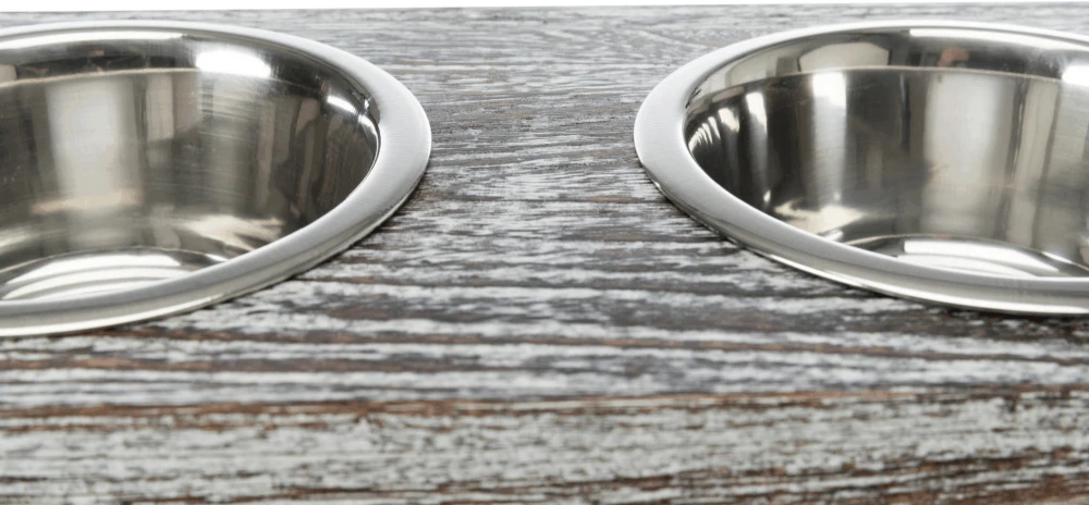 Gamelles pour chiens en acier inoxydable sur un support en bois verni. L’ensemble de gamelles pour chien a été fabriqué à partir de matériaux de haute qualité. Le set comprend deux gamelles d’une capacité de 0,45 l, leur diamètre et leur profondeur sont adaptés aux chiens de petite race et à tous les chats. Les bols sont logés dans un support robuste en bois véritable verni. Le support empêche les bols de bouger pendant le repas et empêche les animaux indisciplinés de les renverser. La base du support en bois comporte quatre pieds pour éviter de rayer le sol.