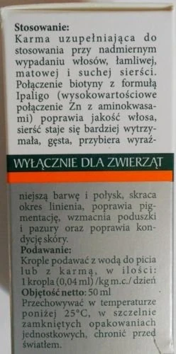INDICATIONS : Chute de cheveux, poil cassant et terne. Les troubles cutanés tels que les inflammations et l’eczéma. La biotine améliore également la qualité du poil chez les animaux en bonne santé, le pelage devient plus durable, plus distinct dans sa couleur et sa brillance. Des doses plus élevées de biotine sont souvent recommandées pour les animaux de concours. Une amélioration visible de la qualité de la peau et du pelage des animaux sains apparaît après un traitement de 3 à 5 semaines.